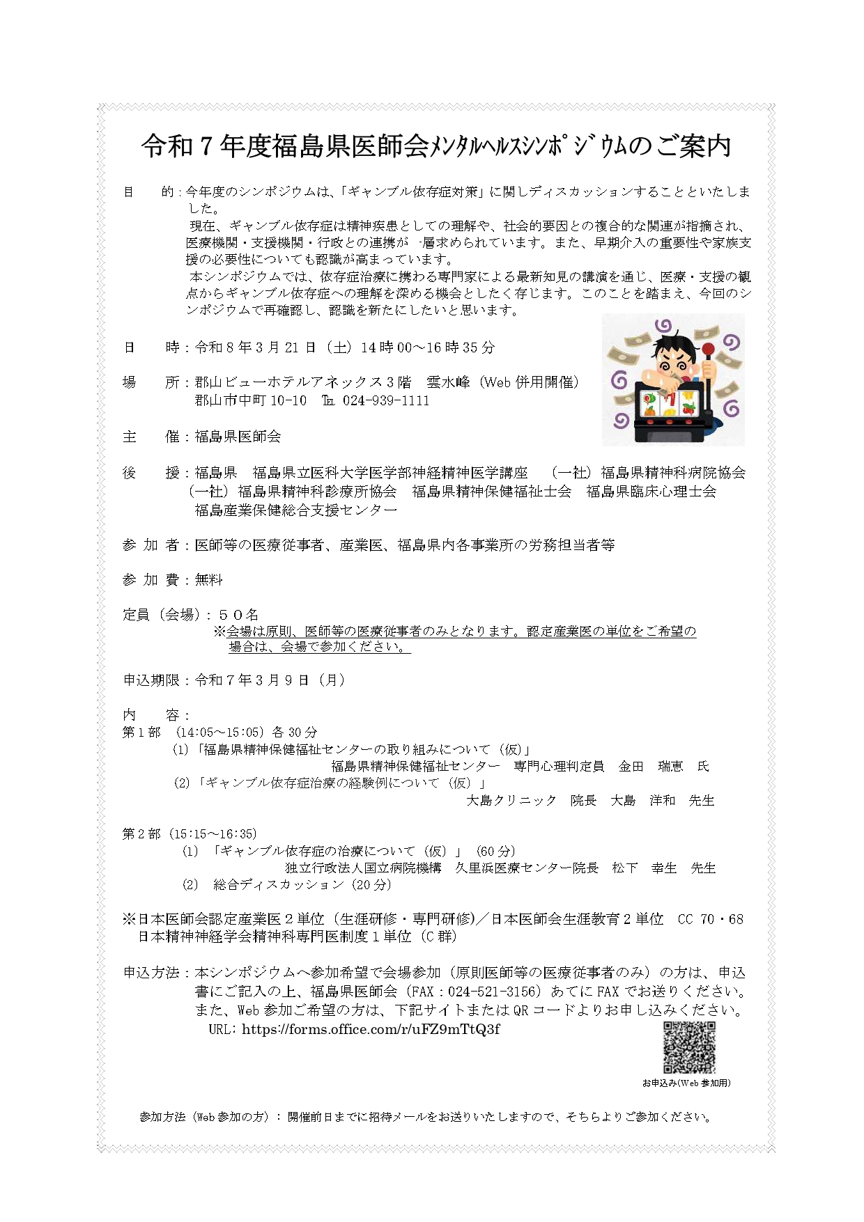福島県医師会より「令和7年度福島県医師会メンタルヘルスシンポジウム」のご案内がありましたのでお知らせいたします。 皆様ぜひご参加ください。